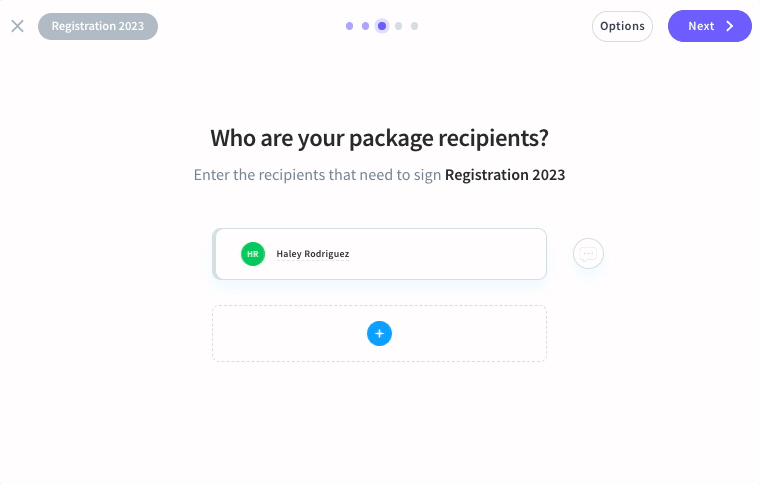 1. To add signing reminders to your document, select Options on the package recipient screen (after Uploading your Document or using the Doc Builder).